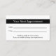 This professional doctor's appointment reminder card is double-sided. Side one says "Your Next Appointment" and has lines for the date and time of the appointment. At the bottom, there's display text you can edit to create a custom message if desired. (Shown: Kindly provide 24 hours notice if unable to keep your appointment.) Side two has display text to replace with the doctor's name (or practice name) and its address, phone number, and website. All text can be edited or deleted. The text is black.