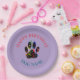 A puppy paw print covered with confetti and streamers. Custom paper plates for parties.
