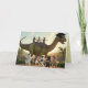A cute dog greeting card featuring a three piece dog band performing on the back of a dinosaur wearing sunglasses and a hat. Looking up at the band is a group of dancing dogs.