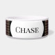 Dog food bowl made of white ceramic has an interesting black pattern as a background for your dogs name. HAMbyWhiteGlove.