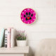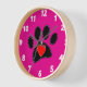 Cute black dog paw print and red heart drawings. Hot pink background version. Custom decorative wall clocks. All that's seen is printed. no actual stitching will be used in the making. Gift idea for women that love dogs.