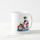 A dog is riding a red motorcycle. His ears, scarf and tail are flying in the wind and his helmet has bone decals.