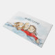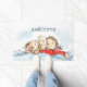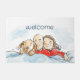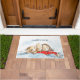 This doormat has an illustration of a cute puppy and its parents, a bald man and a brunette woman. You can customize the text.