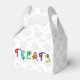 Dog paw print pattern and custom text party decor favour boxes. Custom colourful text for dog related celebrations.