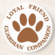 A dog paw print with distressed effect. Text and and drawing in brown.