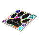 Cartoon dog pawprint in black with colorful dog paw print pattern in the background.