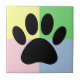 Cartoon dog paw print in black. Squares in pastel colours in the background.