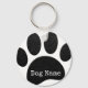 Cartoon dog paw print in black. Faux black leather effect applied to drawing. White background. Custom keychains for people that love dogs.