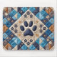 A geometric pattern incorporates large and small dog paw prints, arranged in a symmetrical and colourful quilt-like design