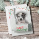 Celebrate the holidays with this cute Christmas card featuring an adorable black and white speckled dog peeking out from a scroll of torn white paper. Set against a clean and simple white backdrop with festive christmas lights in the corners, giving it a splash of colour. Perfect for dog lovers and anyone looking to spread holiday joy, this flat card is a delightful way to send your seasonal greetings. Customze the words, font, font colour and the back of the card. Share the spirit of the season with family and friends through this whimsical and heartwarming design!