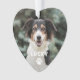 Custom heart shaped commemorative Christmas ornament features a photo of your best furry friend with a simple and modern first name monogram and paw print accent in white. Personalize the design for your new puppy, your family's dog, or in loving memory of a special pet.