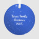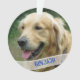 Family pet, dog photo and name Christmas ornament. Acrylic round tree ornament with name template on the front and more custom wording on the back, which is blue with white text.