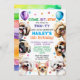Dog Invitation Birthday Party Invites. 11 years old (you can change the age). For boy or girl. Cute happy, smiling puppy illustration invitation designed with confetti and balloons surrounded by popular small dog breeds such as, shih tzu, pug, maltese, chihuahua, poodle, and beagle. All editable text with the child's name, age, time of the party, address, and RSVP. You can change the back image to your child's photo.