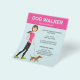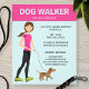 Spread the word about your dog walking business with the help of this Destei design featuring a cute woman with brown long hair. The woman is wearing a pink T-shirt, black leggings and green colour sneakers. She is holding a red dog leash as she walks a cute small brown dog. The top has a pink background colour behind the title area while the rest of the design has a very light blue background colour. Personalize the sample text areas with the details of your business.
