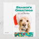 Dog wearing santa hat, holding present holiday card