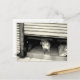 Black and white photograph of cute minature bulldog looking out of a window. He looks sad and lonely.