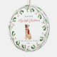 This sweet dog ornament features "my first Christmas in my forever home" typography with pretty red script. Your pet's name is prominent at the top of the design, and is surrounded by a festive botanical and berry painted wreath. The ornament includes a cute german shepherd illustrated dog in the center. A beautiful gift for any fur parent!
