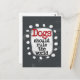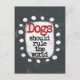 A cute typographic design that says "Dogs Should Rule The World". It's black and red text on a white rectangle with funky, playful dots surrounding it sits on a solid, textured grey background.