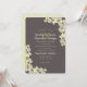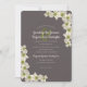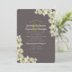 Dogwood wedding invitations to customize line by line. White dogwood blossoms are tinted with maroon pink at the edges and have bright green centers. The flowers cascade along the top and bottom edges. Dark smoke color is the background for pale pink lettering in modern curved text and printed lines with spaces between. A green ampersand holds the names together. Reverse has a fun green and off-white swirling flowers pattern.