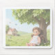 A charming, high-quality miniature scene featuring a small doll with brown pigtails sitting peacefully at the base of a lush green tree. The doll is dressed in a simple white sundress with a small floral detail. In the soft-focus background, a quaint cottage sits nestled in rolling green hills under a bright blue sky, with small birds flying overhead. The lighting is warm and sunny, creating a serene and whimsical atmosphere reminiscent of a children's storybook.