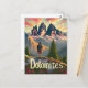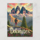 A captivating and nostalgic depiction of hiking in the Dolomites, Italy, showcasing the rugged beauty and dramatic landscapes of the mountain range. The design features hikers traversing scenic trails amidst towering peaks, lush meadows, and alpine lakes. Rendered in a vintage style, the artwork evokes the adventurous and serene experience of exploring the Dolomites, inviting viewers to immerse themselves in its breathtaking natural splendour