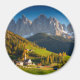 Round souvenir photo magnet of the village St. Magdalena with its church in the Villnoesstal in South Tyrol, Italy, during autumn season with the Geisler Dolomites mountains in the background.