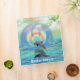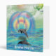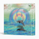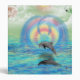 2 dolphins swimming in the ocean near a beautiful rising of colours and water with 2 planets, a moon and a colourful sun. Pink, blue, aqua, yellow and green colours in the water and sky.