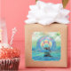 2 dolphins swimming in the ocean near a beautiful rising of colours and water with 2 planets, a moon and a colourful sun. Pink, blue, aqua, yellow and green colours in the water and sky.