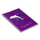 A light grey silhouette dolphin over a multi-tonal floral spiral design, on a purple custom spiral-bound notebook.
