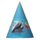 Celebrate in style with a festive dolphin party hat featuring three playful dolphin photos tiled across the design. Between each dolphin, cheerful balloons add color and energy, while the gradient aqua background creates a lively ocean vibe. Under each dolphin, bold text reads “Happy Birthday,” the celebrant’s name, and “Dive Into Fun,” making this hat a joyful centerpiece for any under‑the‑sea celebration. Perfect for kids’ birthdays, ocean lovers, and splash‑filled parties, this hat adds a coordinated touch to your dolphin‑themed event.
