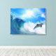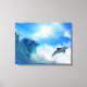 A painting of a dolphin who appears to be surfing in the ocean waves.