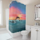 Beach theme shower curtain features a seascape painting of a pod of dolphins swimming and leaping out of the ocean under a colourful sunset. Perfect for tropical, ocean, beach, nautical and coastal decor. Original artwork KL Stock.