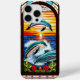 Colourful stained glass art showcasing dolphins leaping gracefully against a picturesque sunset over water, bordered by intricate floral patterns in vibrant tones, symbolizing nature, life, and artistic beauty.