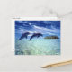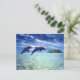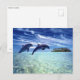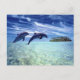 Beautiful animal card showing a group of dolphins jumping through the clear water of a tropical paradise island.