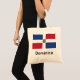 These bags were super cute (I purchased 3). The material is more of a canvas look & feel. The colour of the bag is slightly off white, but the letters look exactly as pictured. I took 3 photos in different lighting. Would recommend! I liked how there was an option to choose the font and colour of the name. The words are legible and the colours are exactly as pictured.