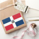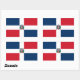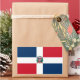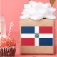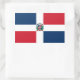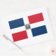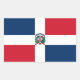 The Dominican Republic flag is red and blue in colour, with a white cross. In the centre is a coat of arms featuring the flag, a laurel branch and palm frond. The flag has a 2:3 ratio.
