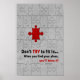 “Don’t try to fit in … when you find your place, you’ll know it!” -- bold red puzzle piece that fits perfectly in a grey puzzle. Text: red and black bold letters.