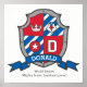 Knights style shield crest letter D monogram art name poster perfect for a boys bedroom or playroom in shades of red, blue, white and grey. Personalize with your child's name and name meaning for a personalized touch to your child's bedroom or nursery, this example is for the name Donald, World leader. Mighty brave, loyal, and proud. Poster print ideal for a gift to a new baby boy, christening, baby naming, boys birthday or baby shower gift. Unique drawing shield heraldry graphic art with eagles head and design by www.mylittleeden.com
