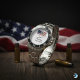 Donald J Trump for president 2024 election steel watch. Support the republican party campaign. Patriotic design with American flag. Keep America Great. Make America Great Again.