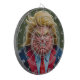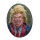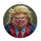 A circular dartboard featuring a caricature of a man with blonde hair and an angry expression. The mans face fills the entire board, and his eyes are wide with green pupils. He is wearing a suit and tie, and his mouth is open in a yell.