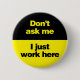 Don't Ask Me I Just Work Here button. Bold text and design to get your message across -- hey man, I just work here! Funny button for retail or office work or any old kind of work.