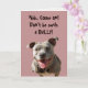 The message on the front of this get well card says, "Ahh, Come on! Don't be such a BULLY!" Inside it says, "Didn't anyone tell you that 'GOOD' patients get well faster? So behave and get well soon!" This hilarious get well card features a handsome Pitbull named Sarge. Sarge is in a sitting position looking very happy and waiting for another stick to be thrown for him. He has a little piece of dry grass sticking out of his mouth, his ears are a bit tilted up as he looks at you with his mouth pulled into a smile and his tongue wagging. A wonderfully comical get well card for everyone.