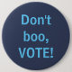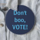 Round button pin shows light blue on dark blue letters reading, "Don't boo, VOTE!" Democrats, liberals, progressives need to VOTE! Get political and make your voice heard. Just like Barack Obama says.