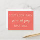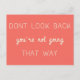 Simple, stylish “Don’t look back you’re not going that way” postcard with modern typography in white with a coral orange background in a minimalist design inspired by positivity and looking forward.