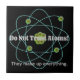 Fun tile design with simple atom graphic and funny "Don't trust" joke quote on black background