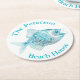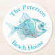 Beach cottage theme pulp board paper coasters, with graphics of a aqua blue doodle style fish, on a white background. Personalize the aqua blue arched text to suit your needs. Great for anytime use and makes a nice gift idea.