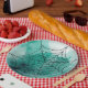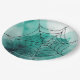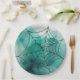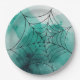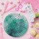 Festive holiday paper plates for Halloween with a doodle spiderweb on a green watercolor background.