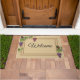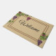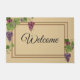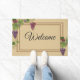 Door mat shown with a grapes print in a tan colour with a welcome print design and tan colour borders.