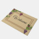 Door mat shown with a grapes print in a tan colour with a welcome print design and tan colour borders.