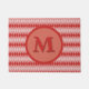 Argyle pattern shows in three shades of red background colour, in alternating rows of dark, medium and light red diamonds. Central to the mat is a red circle with a darker red outline. Centred in the circle is an initial that may be personalized. Letter will show with a drop shadow.